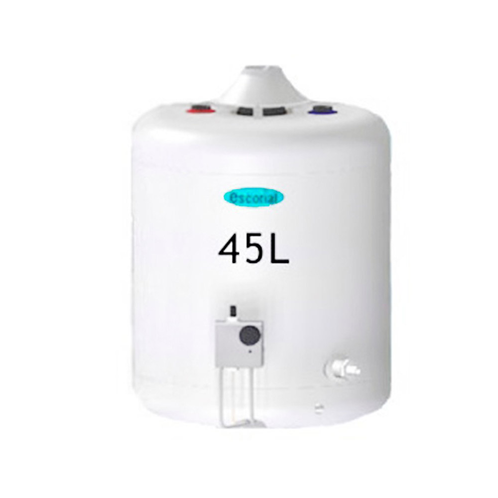 Escorial 45LT es un termotanque a gas con capacidad para 45 litros. A diferencia de un calefón, permite tener agua caliente sin depender de la presión general, aún con el uso simultáneo de varias canillas. Su tanque está construido con protección anti corrosión que elimina los depósitos de óxido que causan las picaduras internas. Puede utilizarse con gas natural o con gas envasado. Es apto para colgar con patas opcionales para apoyarlo.